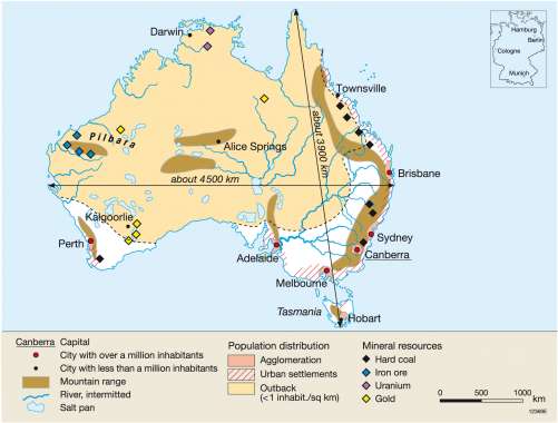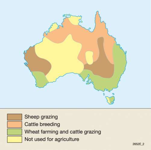 The climatic conditions are also by the belt-term agricultural use and their increasing extensification traced towards the centre. On the wooded hill country in the southeast, is a semi-circle of intensive livestock farming and a wheat belt which eventually crosses over into extensive sheep farming. Large areas of arid regions can only be managed, because groundwater in the form of artesian wells are available. The coastal areas which receive plenty of rainfall, are the favoured areas for human settlement and the aquaculture sector. Tropical produce plantations thrive along the coast of Queensland. On the western side of the southern coast, orchards and vineyards are plentiful.
