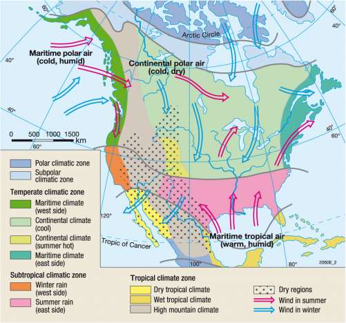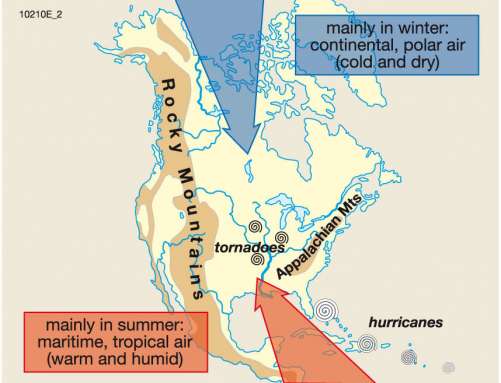 North AmericaBecause of the location and shape of North America, the weather throughout the year is marked by strong meridional exchanges of polar and tropical air masses, in particular, in the north-south extension of the Rocky Mountains along the west coast. This direct exchange of warm, moist air from near the equator and cold air masses from the polar regions, result in parts to extreme weather phenomena and formation of characteristic regional wind systems. Therefore, blizzards and northers in North America in the winter are the result of cold air intrusions from the north which are often associated with high winds and snowfalls. The blizzards often reach the sub-tropical crops in Florida, the influence of northers can even extend into central Mexico.
