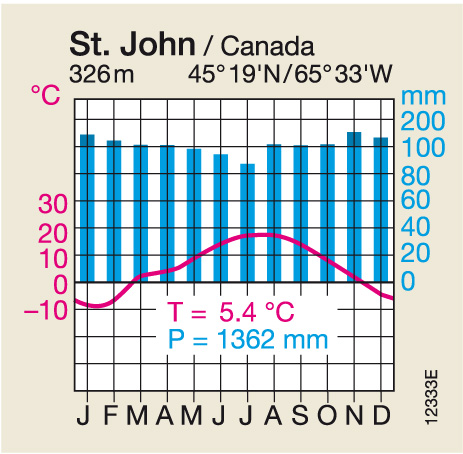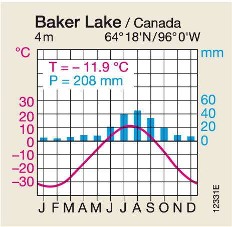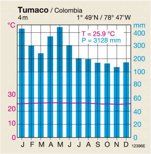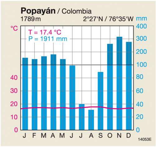 In South America, there are also cold-air intrusions in the polar regions described as Pamperos. Apart from these cold waves, which are clearly characterised in the seasonal temperature changes, is the transition from tropical daytime climate to extratropical annual climate. While in the equatorial tropical areas, January and July average temperatures vary only very slightly, sometimes showing large temperature amplitudes in the daily cycle. With increasing latitude, the seasonal temperature differences increase. This is particularly evident beyond the tropics.Significantly, distinctive differences in temperatures in the north-south direction is the zoning of temperature with height. The level of frost-free lowland tropics in South America, such as in the Tierra caliente (annual average temperature above 22 °C) and Tierra templada (annual average temperature 16—22 °C), are denoted. In the area of the equator, this altitude level of complete frost-free areas reaches about 2,500m and decreases towards the poles. With annual average temperatures from 6—16 °C, regular frosts occur in the area of Tierra fria. At an altitude of about 3,500 m, annual average temperatures of 0—6 °C are reached in the equatorial zone of the Andes of Tierra helada. The number of changeable frost and ice days increase considerably. The Tierra Nevada, is indicated as an area of permanent snow, and starts in the humid inner tropics at about 5,000 m.