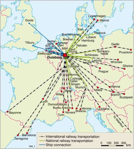 In comparison to 1840, a northward migration and a consolidation of coal mining locations are clearly visible. Site consolidation has also taken place in iron and steel manufacture. The area of settlement has expanded considerably in comparison to 1840, and the infrastructure has been developed. In the framework of further industrialization, numerous sites have come into existence in association with the industries of the second wave of industrialization (especially chemicals) after 1840. Among other things, the continuous development of this location is connected with the oil pipelines to the seaports of Rotterdam and Wilhelmshaven. In addition, numerous power station sites have come into existence.